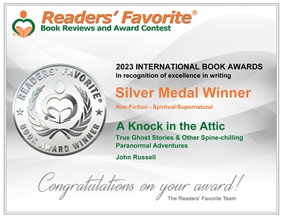 "Russell's paranormal and life experiences are engaging, charming, and offer a unique perspective on questions of life and death." — The BookLife Prize (Publishers Weekly) "These stories are terrifyingly fantastic. The author's experience as a psychic and ghost chaser allow him to tell unique, haunting stories. This book is hard to put down." — 30th Annual Writer's Digest Self-Published Book Awards "From the very first chapter to the very last, A Knock in the Attic is a page-turning adventure every fan of the paranormal and good old-fashioned ghost story will love. A captivating and sometimes humorous collection of the author's personal interactions with the metaphysical and unexplained over his lifetime, the book serves up a heaping share of goosebump-worthy accounts that will make it difficult for even the staunchest non-believer to dismiss the existence of ghosts and visitors from the Other Side. And for some readers, learning how the author has used his psychic gifts to help others adds a warm touch to what could otherwise be a 'chilling' story!" — Nonfiction Authors Association Book Awards "Doc and I have both finished reading A Knock in the Attic. We were hooked from the first paragraph, and once we started it we couldn't put it down. It's a fascinating read that will hold your attention until the very end. We both love it, and we have a hard copy as well as two Kindle editions. We love John's style of writing: he writes in such a way that you feel like you are having a personal conversation with him on your back porch. Well worth the price. Keep writing John...your two biggest fans want more." — Jeanne & Doc Staso CLICK HERE to read MORE reviews from readers; editorial reviews (including KIRKUS REVIEWS, BookLife, and more); and to watch an introductory video about John and A Knock in the Attic. Quarterfinalist in the BookLife Prize for Nonfiction ![]() ![]() ![]() ![]() |